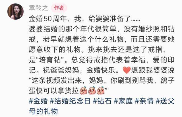 今天(10月19日),陈龙老婆章之龄更新社交动态,引发关注。她说,公公婆婆金婚50周年,作为儿媳,她老早就想好了送什么礼物,那就是戒指,是“培育钻”。因为公公婆婆那个年代没