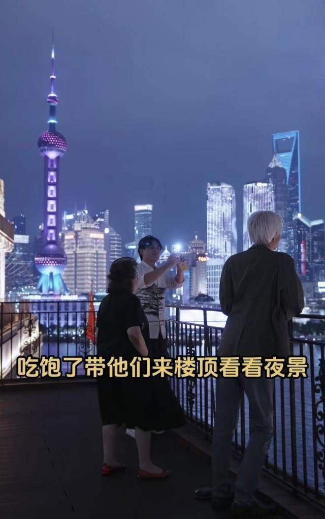 吃饱后,陈龙带着爸爸妈妈上楼顶看夜景,拍照留念,一家三口其乐融融。
