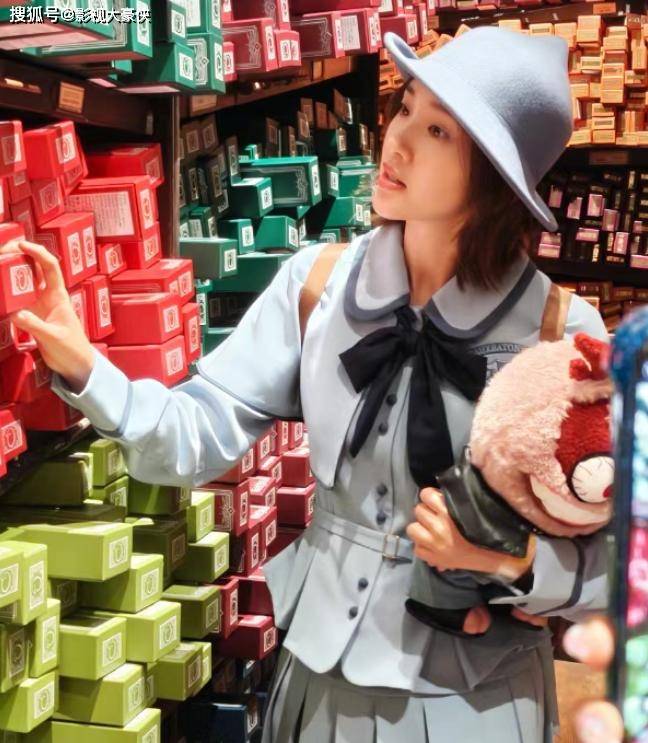 若想寻觅唐艺昕身上不沾染“魔法”气息的片刻,其一,是她端坐在皮质过山车上,从容地面对镜头,单手轻盈地比出“耶”的手势,还不经意间露出女儿的一只小手;其二,则是她怀抱着造型奇异的毛绒娃娃,于魔杖店内悠然漫步的姿态。