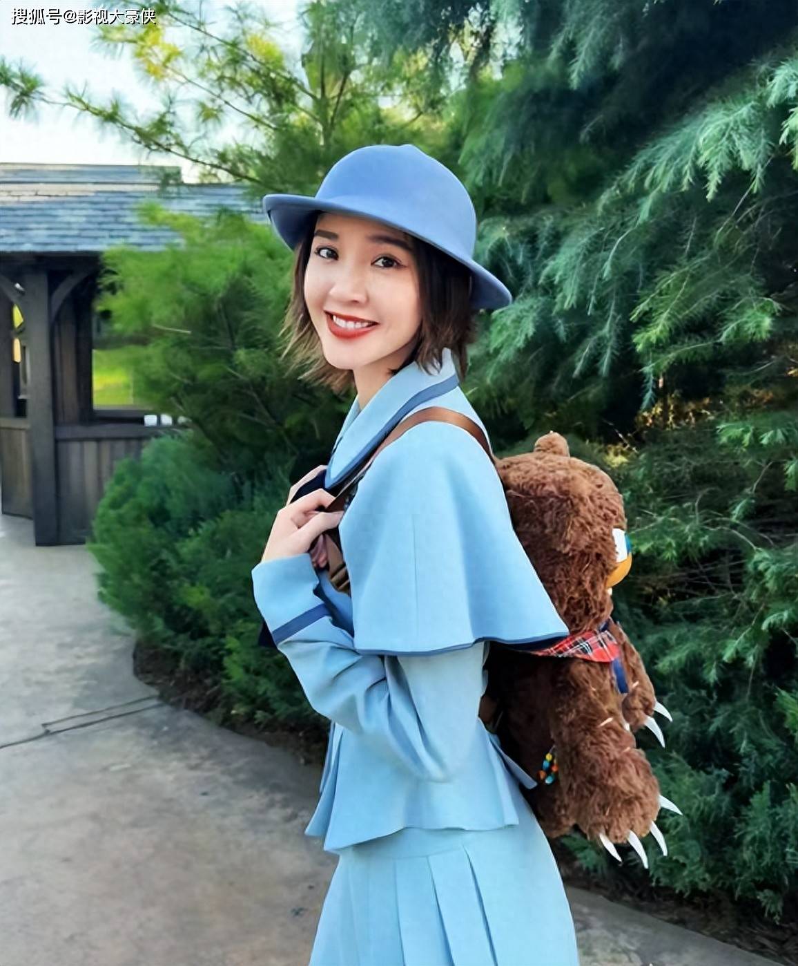 她身着一件雾霾蓝的纽扣上衣,这件上衣独具匠心,配有披肩小斗篷与收腰设计,再搭配同色的百褶半裙。海军蓝与藏蓝色的装饰条及配饰恰到好处地点缀其上,为整体造型赋予了丰富的层次感。为与这一身精妙的装扮相契合,她所佩戴的帽子亦是雾霾蓝色,而身上所背的背包则是一只造型独特的卡通小熊,软萌之中又透着几分暴力美感,尽显其时尚品味。