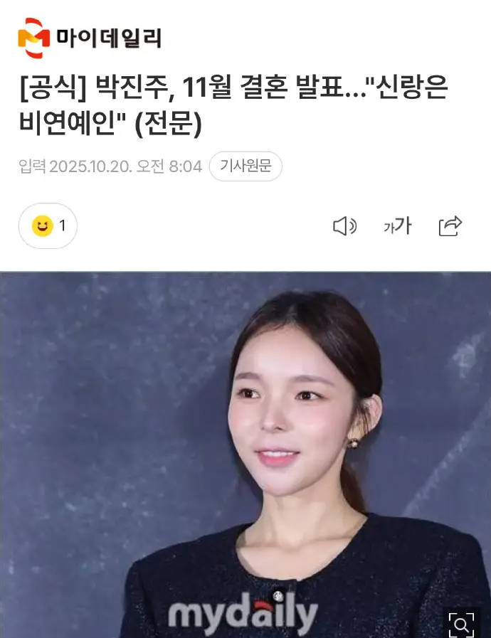 20日,演员朴真珠官宣将于11月30日结婚,丈夫为素人,婚礼采取非公开形式。据悉,朴真珠曾出演过《阳光姐妹淘》《当你沉睡时》《德鲁纳酒店》《那年我们》等众多影视剧。
