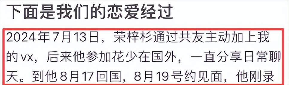 据她自述,荣梓杉与她的开始,是前者主动找共同好友联系上的。
