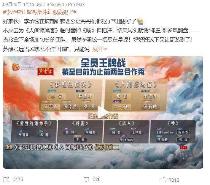 我们可以看到,李承铉的表现是非常亮眼的,他清醒地分析战局,利用分差优势帮助哥哥们获得第四轮舞台公演的胜利,当时李承铉选择《唤》舞台,这个舞台的表演者是:陈小春、丁震、张远、李承铉,实力是非常强的,所以其他战队直接押宝《唤》,但李承铉却表示:这个舞台太暗了,现场观众不会喜欢,所以他选择押宝其他歌曲,最终只有X-brother加了十分。