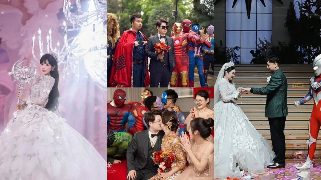 主题化定制更成为年轻人的自我表达。2025年4月,某千万级网红博主举办了一场《魔卡少女樱》主题婚礼,身穿婚纱的新娘手持魔杖站在亮起魔法阵的粉色舞台中央,从装饰到伴手礼全程还原动漫元素,被网友感叹“像少女漫的结算画面”。山东临沂一对新人打造了《穿越火线》主题婚礼,伴郎团cos游戏角色,接亲环节设置电竞对抗,交换戒指时司仪高喊“这对CP已推倒对方水晶”,将新郎的电竞情怀融入仪式核心。B站UP主“逍遥李咯”的婚礼则邀请大量特摄Coser到场,动漫服饰、二次元场景与非传统流程结合,成了一场Cosplay狂欢盛会。