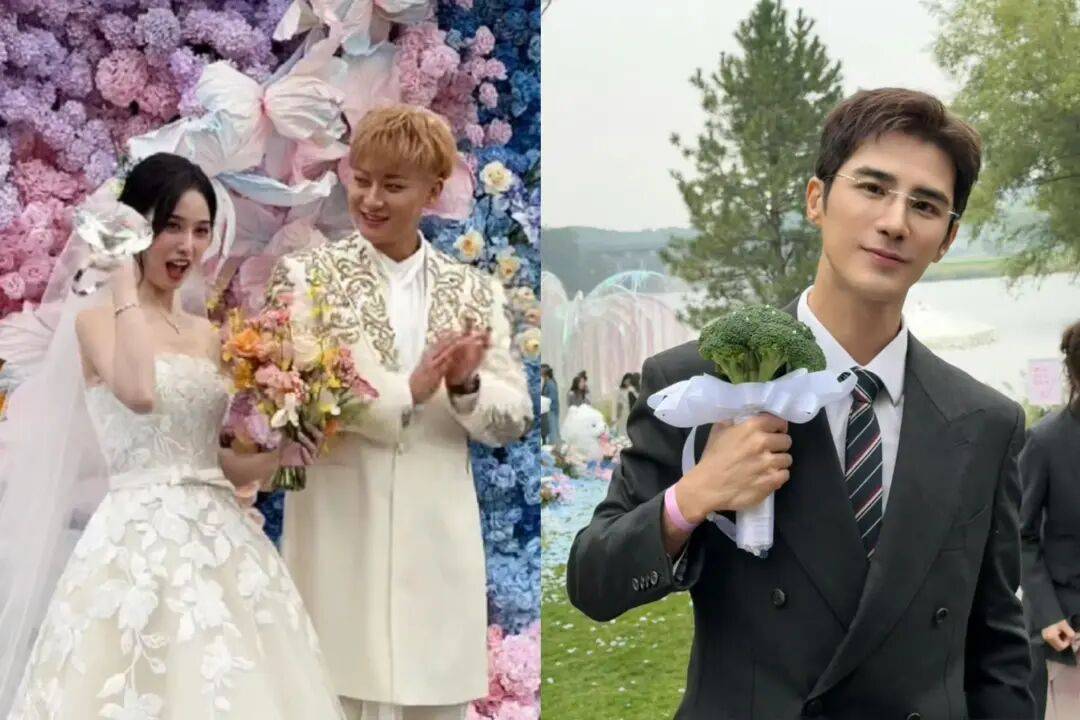 黄子韬给徐艺洋戴戒指时手滑三次,玻璃假钻戒摔在草坪,弯腰捡拾又碰倒气球支架;抛手捧花环节突然塞给姜潮西兰花,绿蔬菜配粉花海成了网友口中的“综艺事故”。这场被调侃“农家乐婚宴”“微商派对”的婚礼,偏要在直播里摊开所有狼狈。