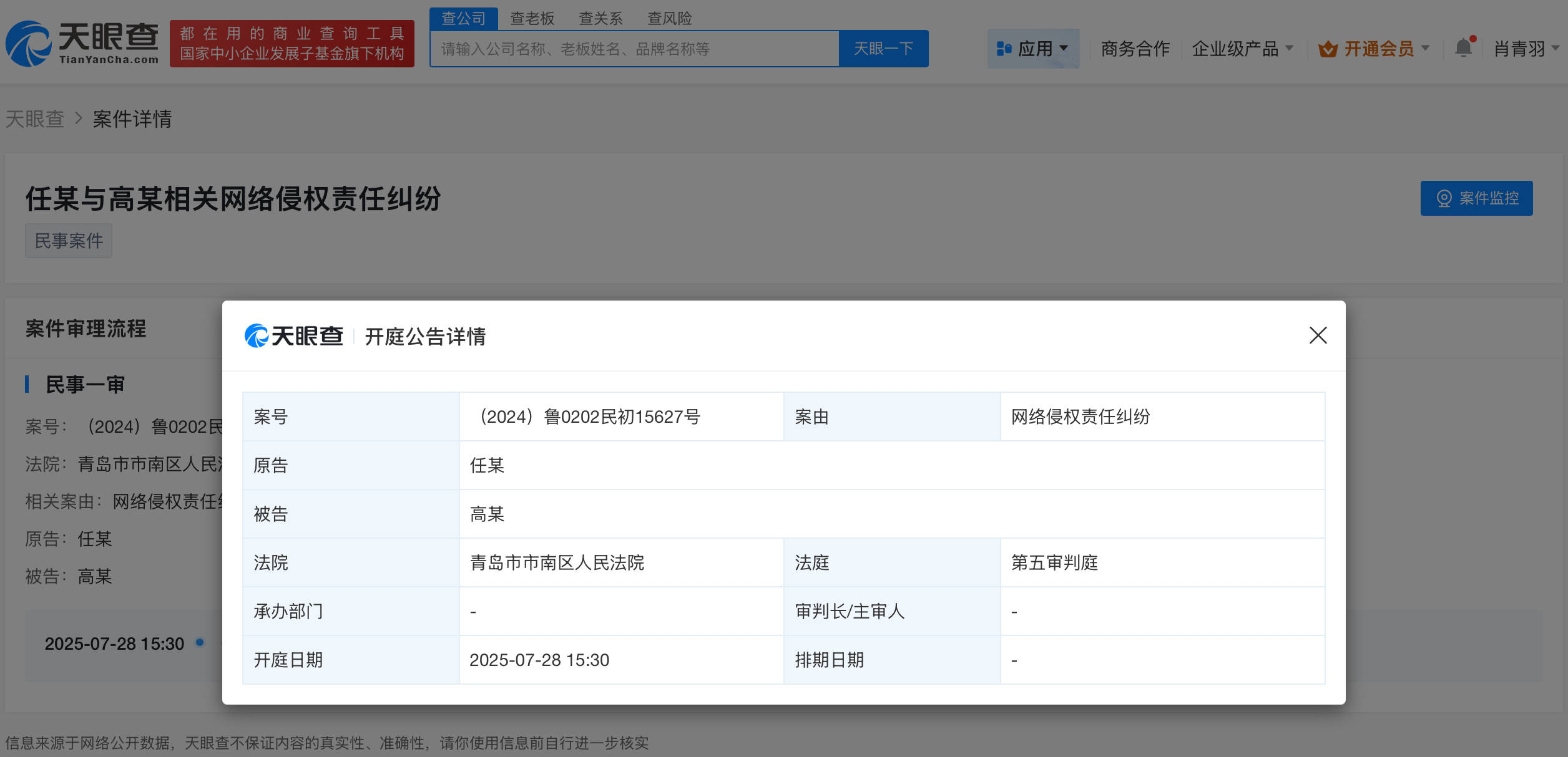 据天眼查法律诉讼信息显示,近日,任国超(任嘉伦)与高某某相关网络侵权责任纠纷案件新增开庭公告,原告为任国超,该案已于7月28日在青岛市市南区人民法院开庭审理。