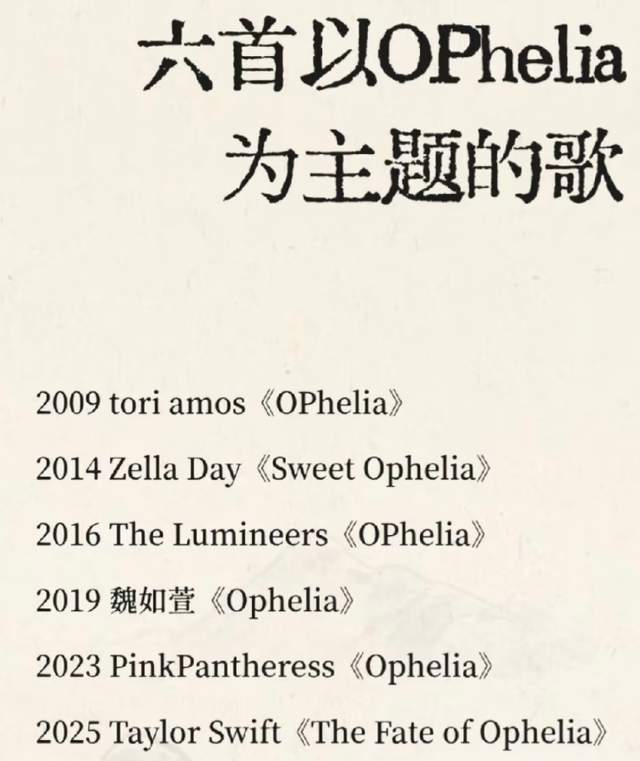 奥菲莉亚是莎士比亚悲剧《哈姆雷特》中的女性角色,更是多位艺术家的灵感来源,许多知名画家都创作过以奥菲莉亚为主角的作品,放到全球乐坛,霉霉不是第一个致敬奥菲莉亚的歌手,更不是唯一一个,于是争议出现了。