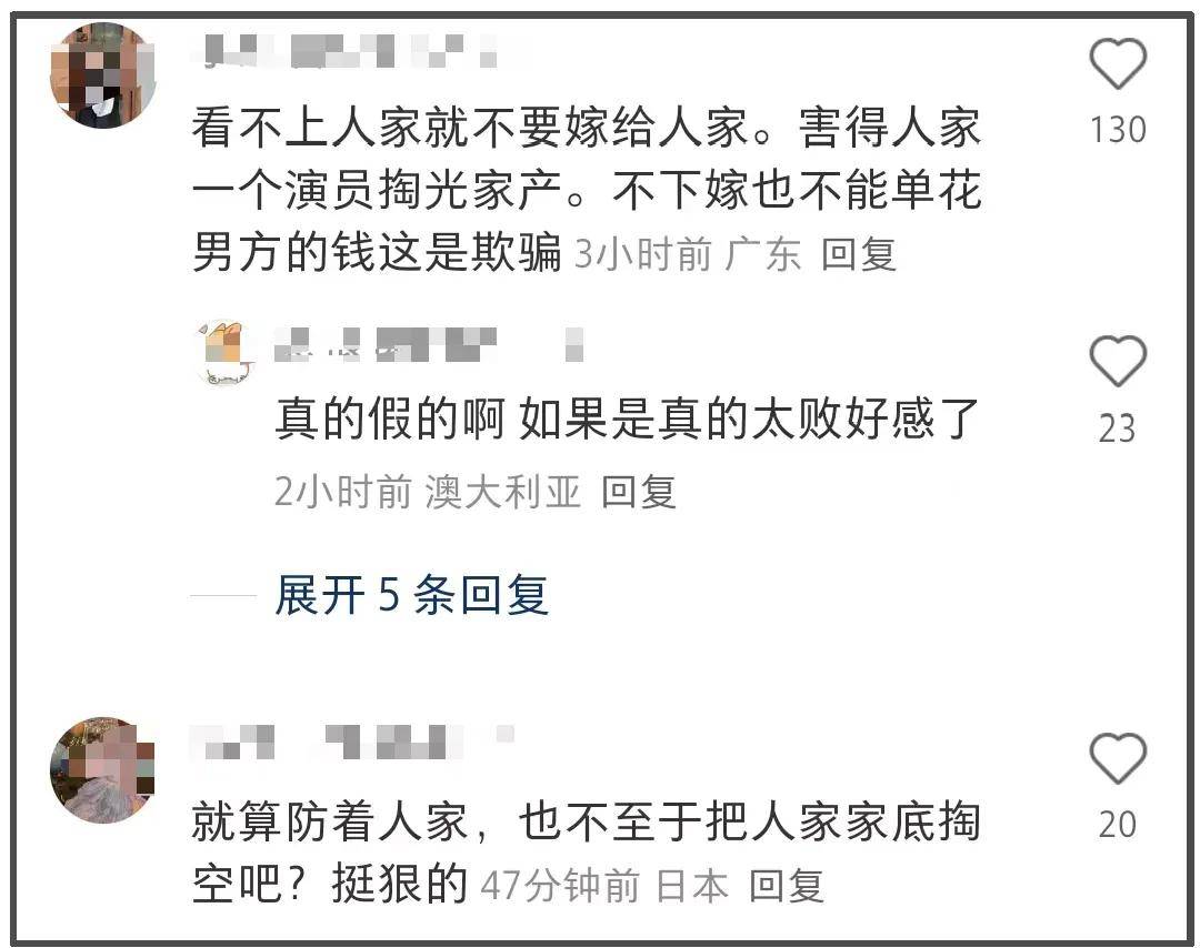可能是“花完积蓄”的字眼太过惊悚,何超莲的评论区直接沦陷了。不少网友嚷嚷着“看不上就别嫁,害得人家掏空家产”,更是斥责“何超莲下嫁单花男方的钱是欺骗”,简言之就是骂何超莲骗婚。