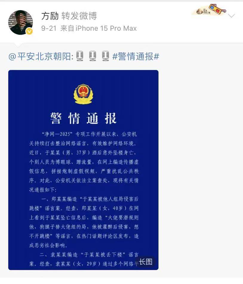 方励还转发了警方关于于朦胧事件有人造谣的通报,再次证明自己与于朦胧坠楼事件无关。