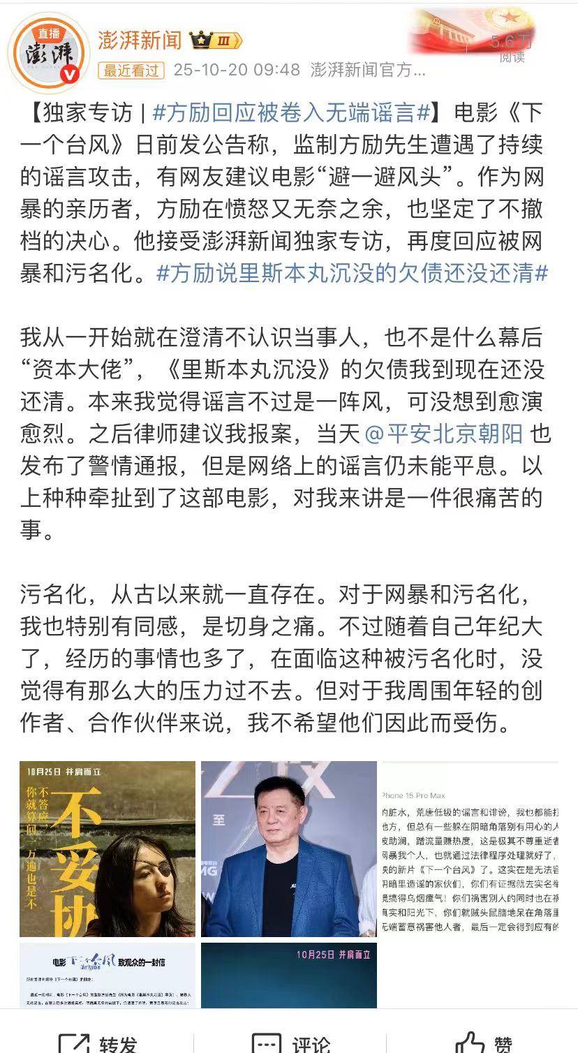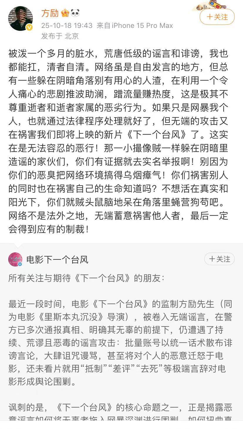 于朦胧的酒后坠楼身亡这事应该翻篇了,但却因为一些不明原因的谣言,将电影《下一个台风》的监制方励老师卷入其中,尽管他报警起诉不实言论,但似乎还是没多少用,因为波及到他监制