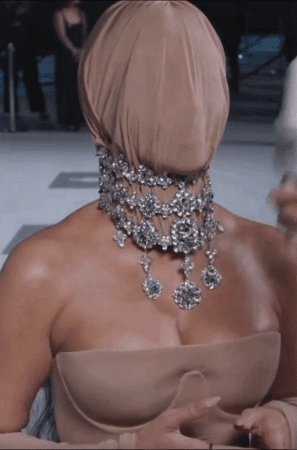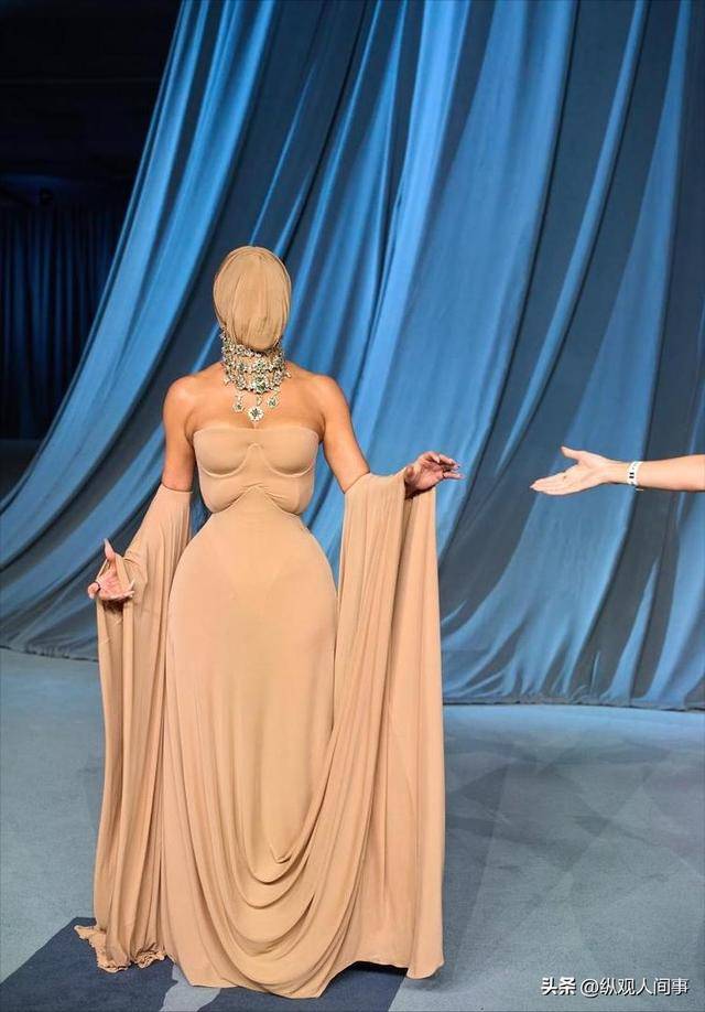 金·卡戴珊此次选择了Maison Margiela Couture的裸色蒙面造型,搭配四层钻石项链,束腰设计却引发了"双层胸"的争议。