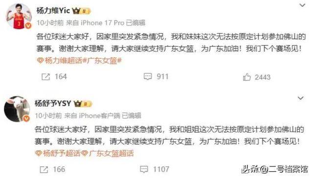 在13号的时候,杨力维、杨舒予两位篮球女将突然在网上发文表示: