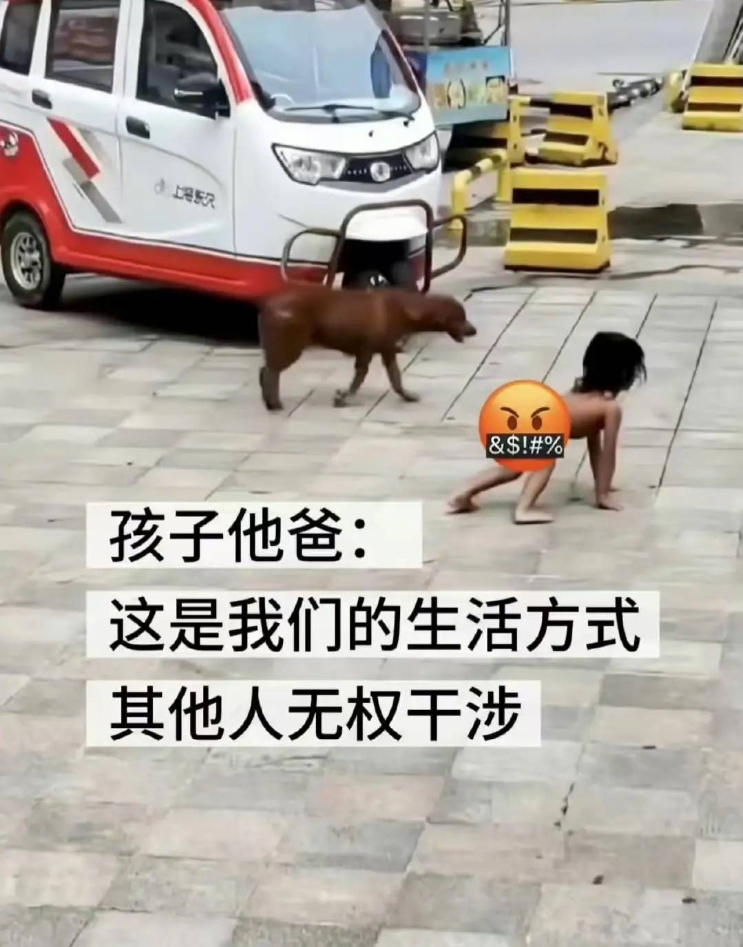 孩子的父亲,听说是一个狗场的老板。在他们身边,一直跟着一只狗狗。小孩和狗狗一样,就经常这样不穿衣服趴在地上,小孩子看着很瘦弱,虽然3岁了、但感觉还没一岁的孩子大。