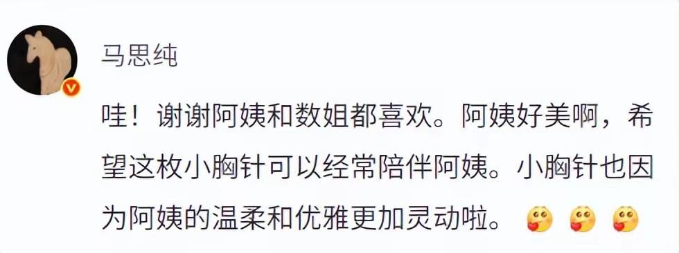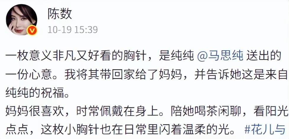 当天正好是陈数妈妈的生日,陈数就表示正好不知道送妈妈什么礼物,这个胸针就刚刚好。陈数妈妈知道礼物是马思纯送的,也对马思纯表示了感谢。
