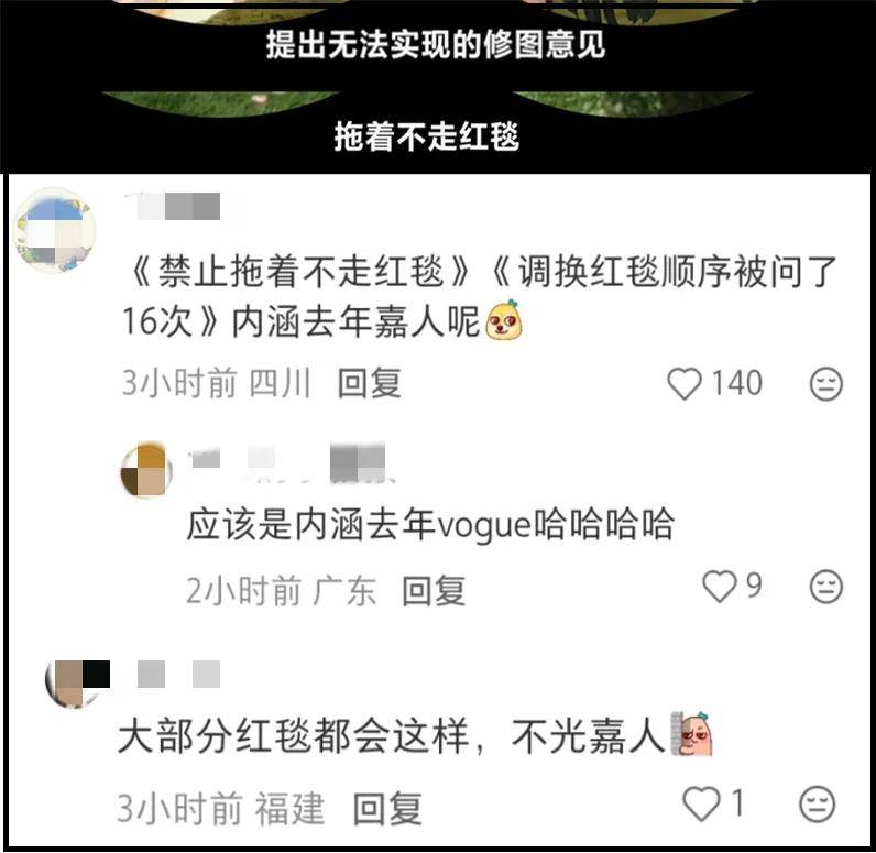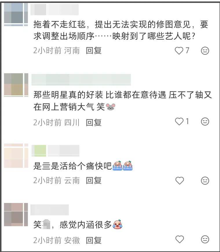 评论区瞬间开始吃瓜,但正如网友所说,内娱大部分红毯都这样,抢位置、抢顺序、抢压轴,都是上一代大花延续下来的传统了,活动主办方一向深受其苦,有时候忍不下去就不惯着了,不走红毯就关灯,现场毯子卷起来,工作人员都撤退!
