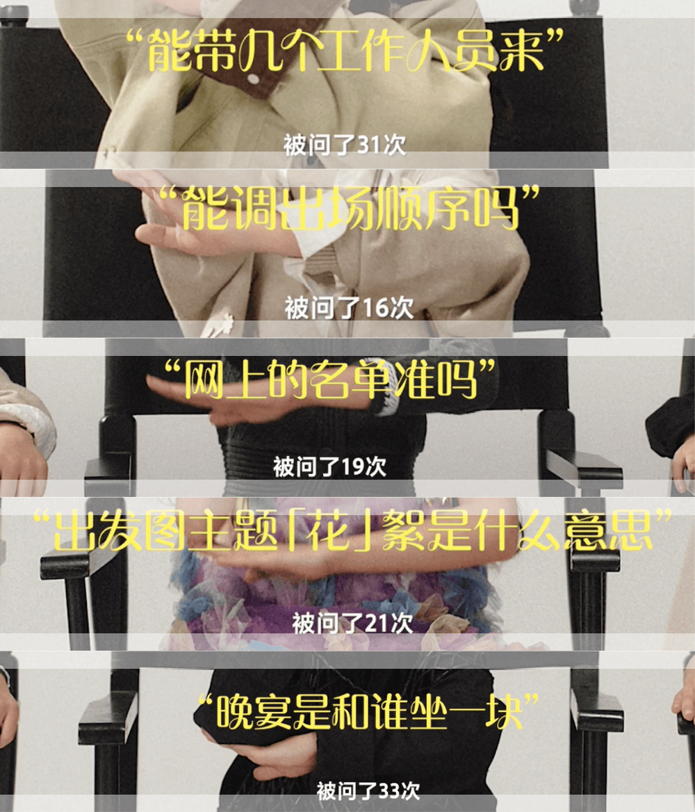 一场VOGUE盛典,工作人员被问了31次“能带几个工作人员”、被问了16次“能调出场顺序吗”、被问了19次“网上的名单准吗”、被问了33次“晚宴是和谁坐一块”,有的明星和他们的团队,甚至连出发图主题“花”絮的一语双关都看不懂,内娱绝望的文盲是不是有点太多了啊!