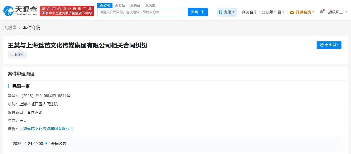 近日,据天眼查天眼风险信息显示,上海丝芭文化传媒集团有限公司新增2条开庭公告,原告分别为周诗雨、王奕,案由均为合同纠纷,上述案件将分别于11月19日、11月24日在上海市虹口区