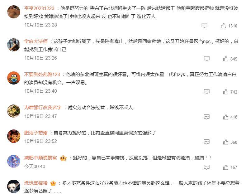 这波“为了生活”的务实操作,反而赢得了全网尊重。网友们纷纷肯定其“劳动无贵贱”的价值观,认为“放下面子挣钱更值得尊重”。有人感慨:“这孩子太能折腾了,先是陪爬泰山,然后是回家种地,这又开始在景区当NPC,挺好的,总能找到工作养活自己。”更多评论则赞誉他打破了职业鄙视链,模糊了“演员”与“服务者”的边界,堪称“职业平等理念”的实践者。
