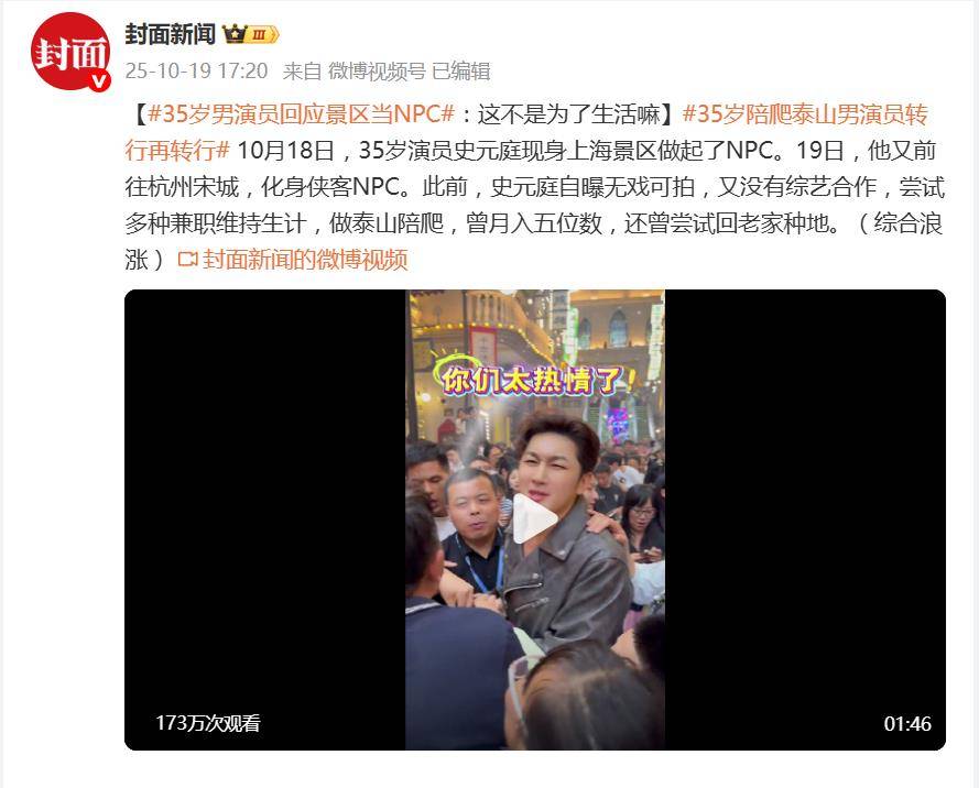 “这不是为了生活嘛!”——35岁演员史元庭一句朴实无华的大实话,最近火出了圈。从中戏毕业的影视演员,到泰山陪爬、家乡种地,再到如今辗转于上海、杭州景区的职业NPC,他的“跨界再就业”史,成了行业寒冬下一抹真实的生存图鉴。