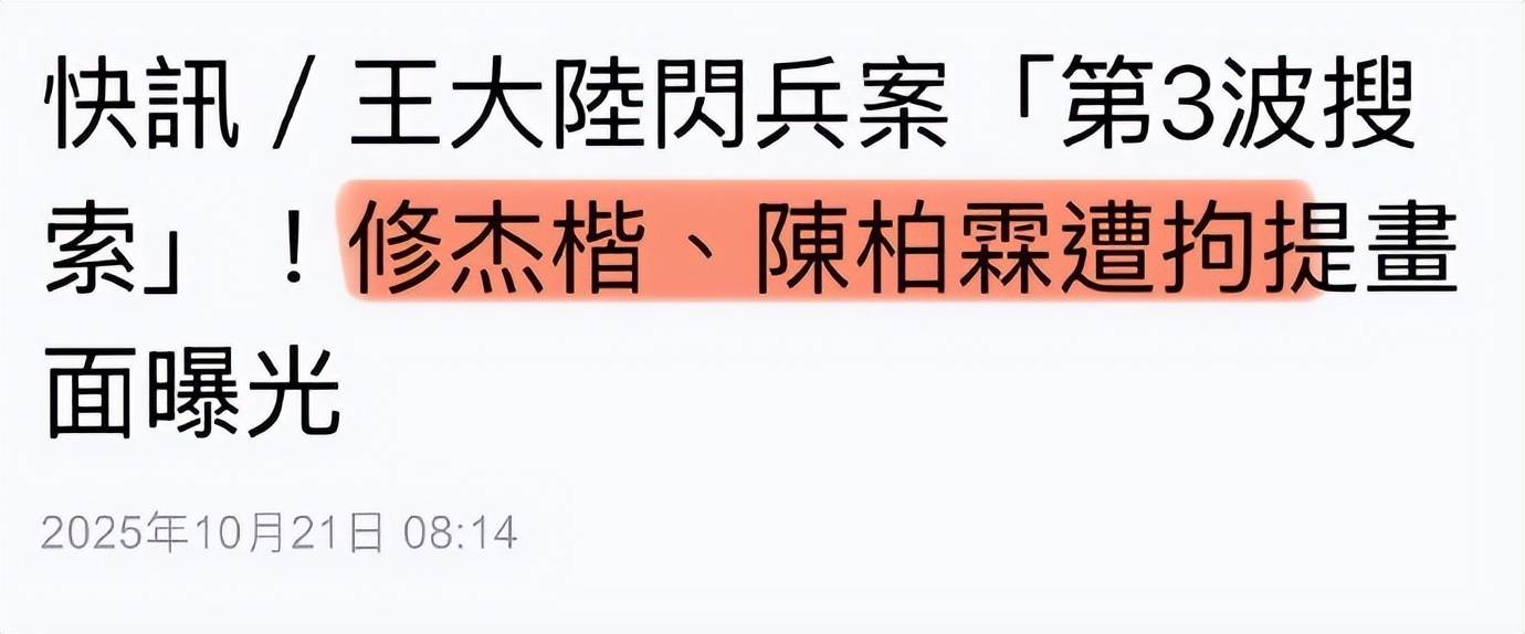 据台媒10月21日报道,王大陆“闪兵案”持续发酵,检警于今日清晨再出重拳,展开第三波大规模搜索行动。此波行动中,知名艺人陈柏霖、修杰楷及Energy成员张书伟均被警方