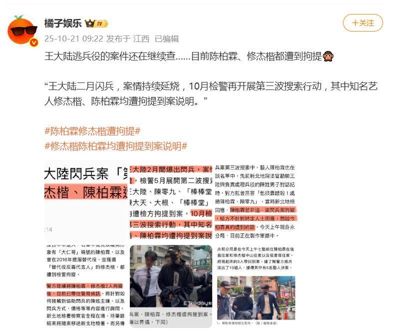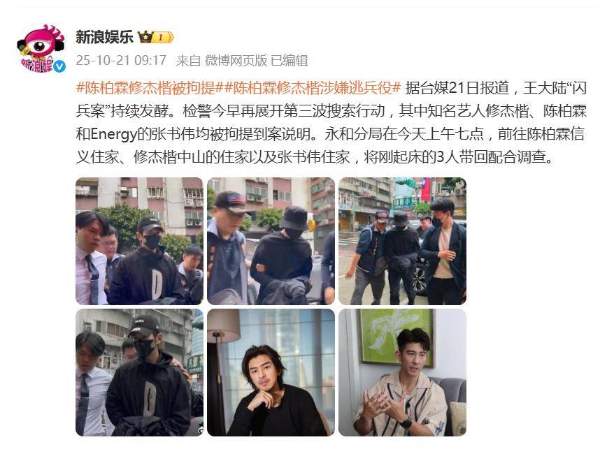 据台媒10月21日报道,王大陆“闪兵案”持续发酵,检警于今日清晨再出重拳,展开第三波大规模搜索行动。此波行动中,知名艺人陈柏霖、修杰楷及Energy成员张书伟均被警方拘提,三人皆是刚起床就从家中被带走配合调查,场面震撼。