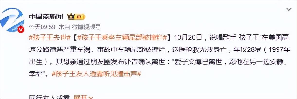 热搜“#孩子王去世#”背后,是一场猝不及防的生死离别。10月20日,28岁的说唱歌手“孩子王”(本名文博)在美国某高速公路遭遇严重车祸,车辆尾部被撞至变形溃