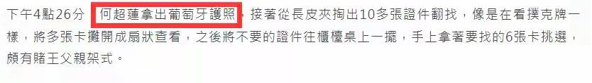 在翻找护照的时候,何超莲直接在长长的皮夹里拿出来一把。经常满世界飞的富家千金就是不一样,这证件都可以当扑克牌用了。