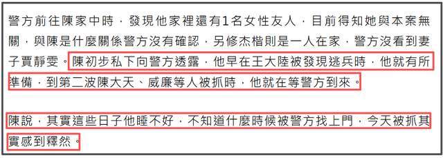 据悉,陈柏霖被抓走时家里还有一位女性友人,不知是不是女友。陈柏霖态度倒也坦然,向警方透露早在王大陆被发现逃兵役时,自己就有所准备,到棒棒堂威廉等人第二波被抓后,他就等着警方来。陈柏霖甚至直言,因为这件事,这些日子他自己也睡不好,如今被抓感到释然了。