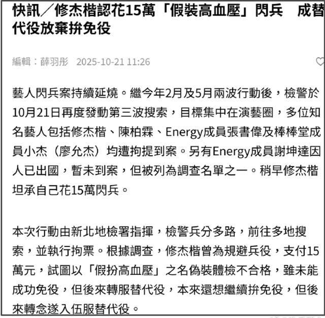 王大陆涉嫌逃兵役的案子持续波及娱乐圈。10月21日,检警将台湾省男星修杰楷、陈柏霖和Energy的张书伟、棒棒堂成员廖允杰都带回局里配合调查。