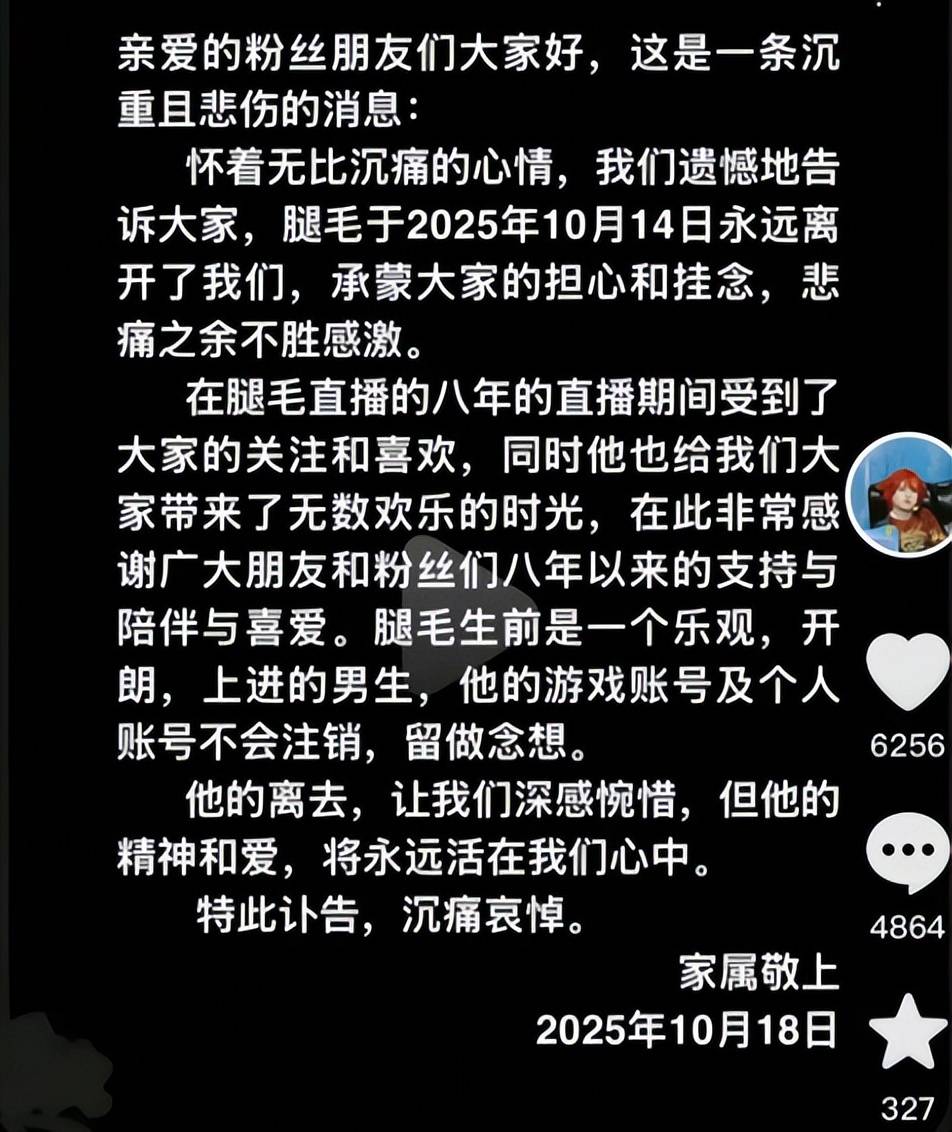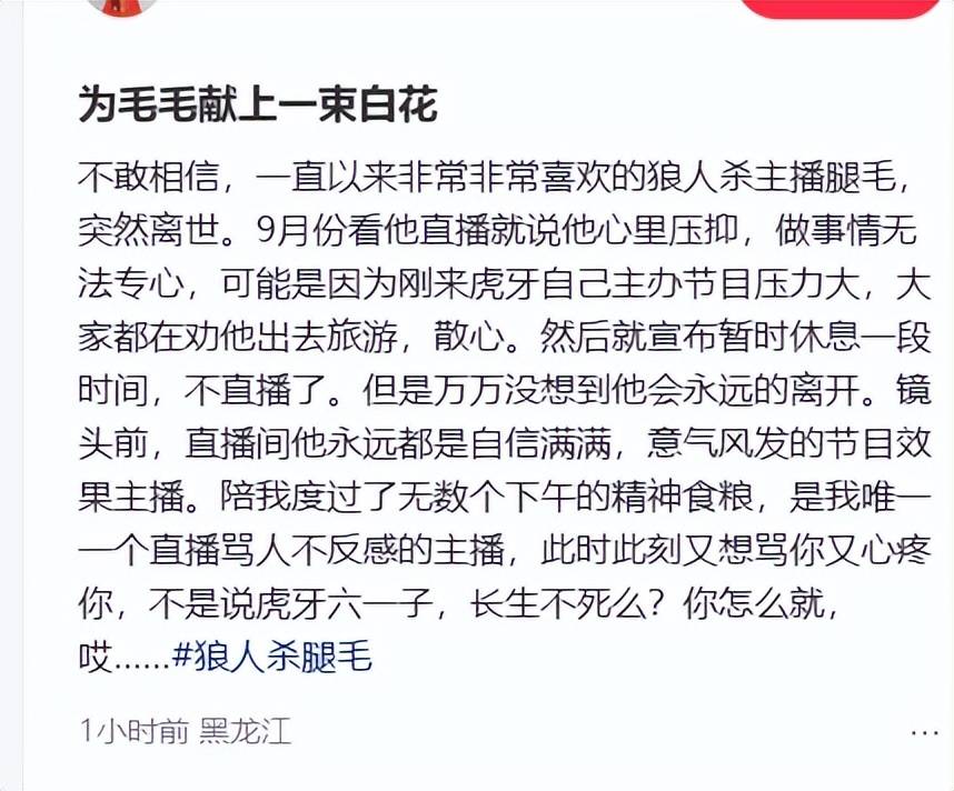 10月14日,狼人杀主播腿毛去世,年仅29岁。