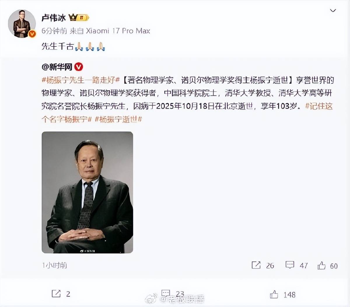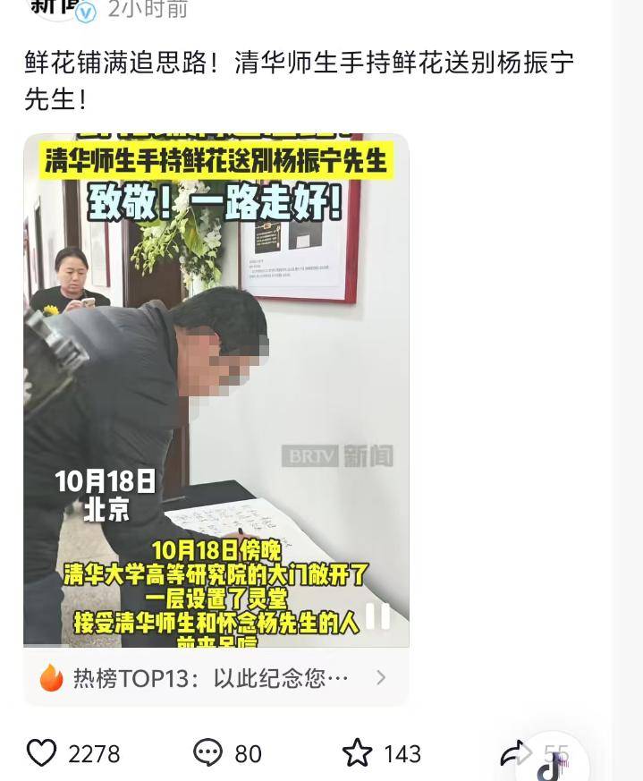 杨振宁的去世引发网友一片哀悼,但娱乐圈却是格外的安静,只有一位三线开外的小明星黄炎悼念了他,其他明星都没有群起转发悼念。