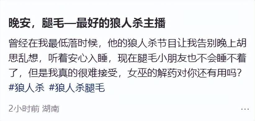 腿毛的知名度不如娱乐圈的明星,但在爱好狼人杀的网友眼里,他的影响力也胜似明星,他曾经影响了很多狼人杀爱好者的职业规划,粉丝还给他取了个爱称叫毛毛。