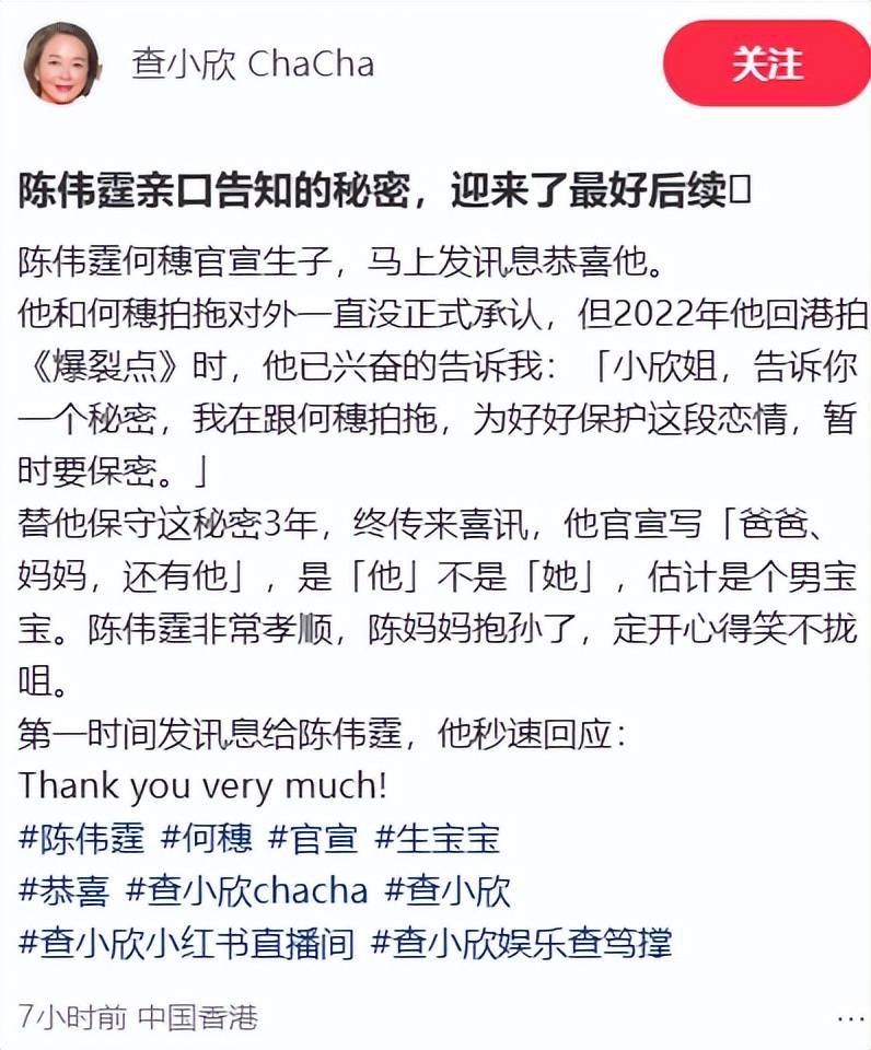 陈伟霆、何穗两人跳过官宣结婚的步骤,直接宣布生子,让很多网友都觉得有些猝不及防。