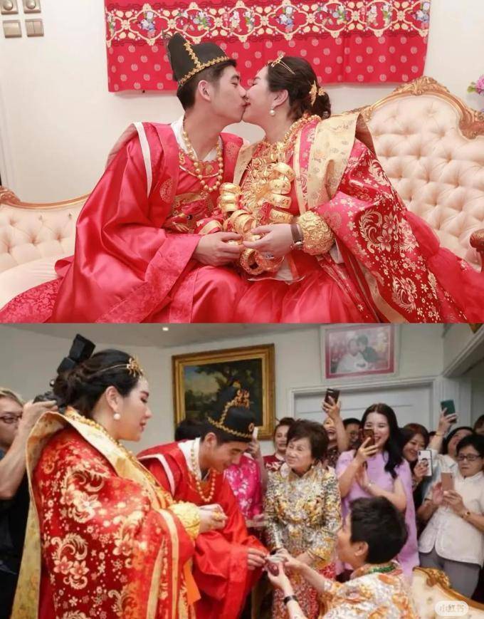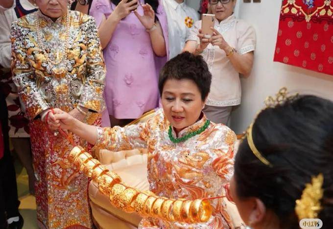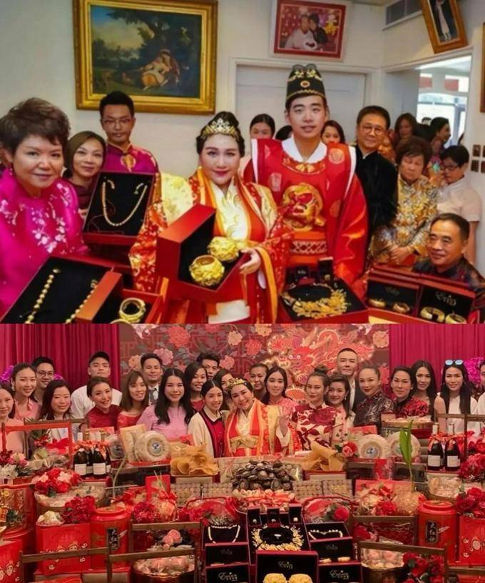 这是何超盈婚礼时的嫁妆,一片金色的光芒,何超莲脖子上和手上数不清的金镯子,富贵迷人眼。