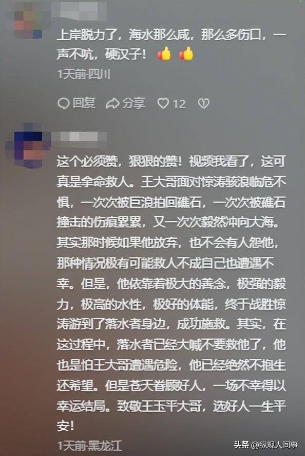 据悉,王玉平今年已经59岁了,他虽然爱好游泳,但体力肯定不能和年轻人相比,在如此恶劣的条件下,他依然选择奋不顾身去救人,可见内心有多善良。