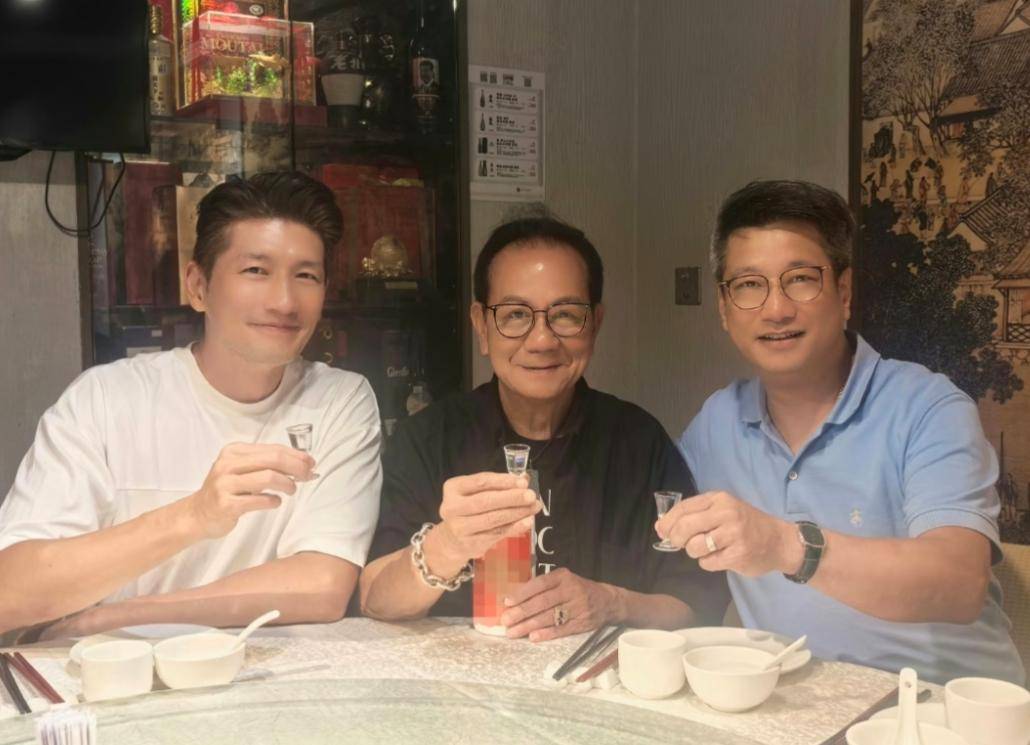 他们这是一群老朋友吃饭,潘志文自己也70了,看着也顶多60,就是演那个《新上海滩》冯敬尧的,他发的照片里还有袁文杰,53岁,还是那么帅,几个人拿着酒杯笑,桌上那酒瓶子,虽然给P过了,但明眼人一看就是茅台嘛,哈哈,