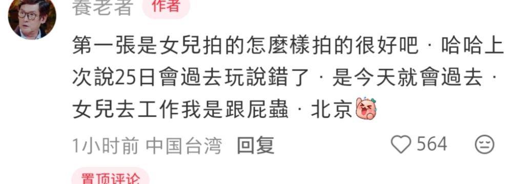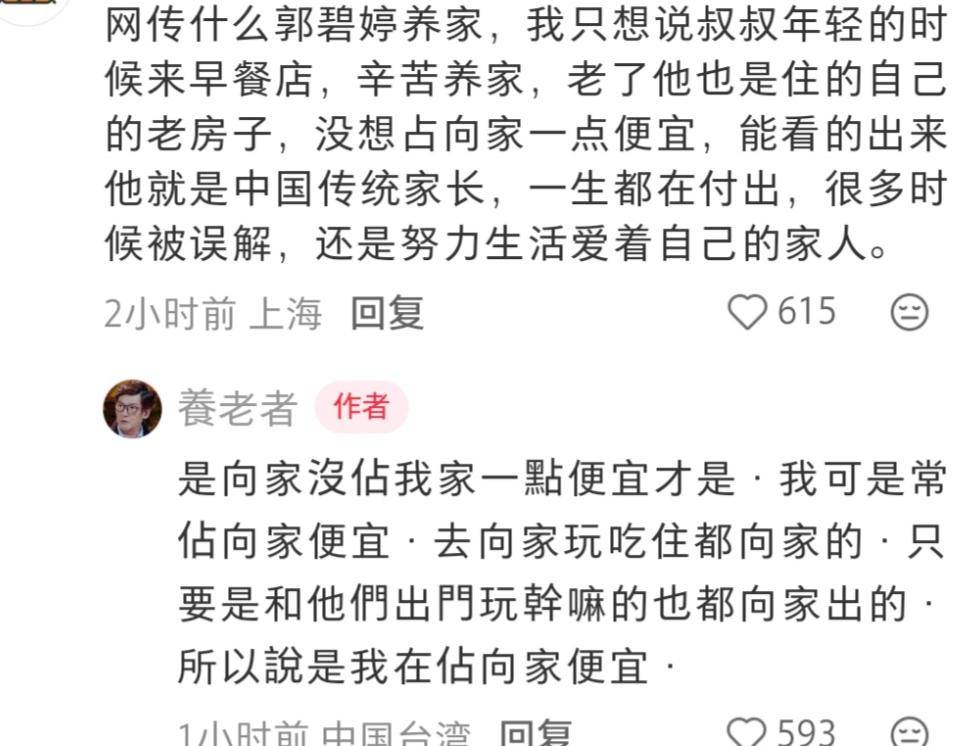 最好玩的是评论区, 大家都在祝他健康,提醒他加衣服什么的, 结果有个网友就感慨,说郭爸爸是传统家长, 一辈子辛苦,老了也不占向家便宜,住在自己老房子里, 哎,这话可能戳到郭爸爸了, 他居然亲自回复了, 他的回复才叫实在, 他说,“是向家没占我家一点便宜才是,我可是占向家便宜”, 他解释说,他去向家玩,吃啊住啊,都是向家的, 只要是跟着他们一家人出去玩,也都是向家的,