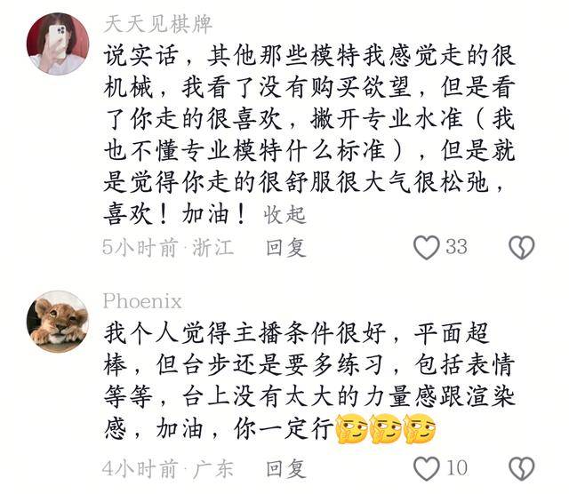 网友们在评论区里,有的夸她进步快、有潜力,有的贴心给她提建议,比如 “台步可以再稳一点”“眼神可以更坚定些”,但大家都一致认可她确实适合模特这条路。