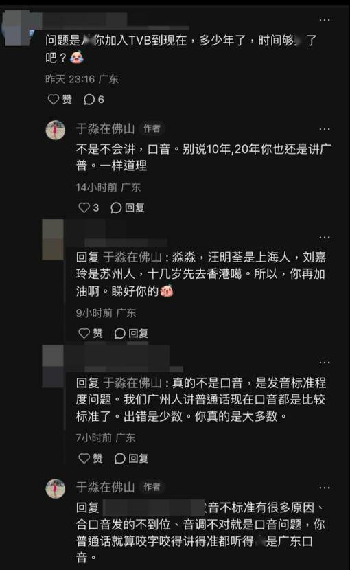 于淼这段视频引发热议。网友质疑:“问题是从你加入TVB到现在,都多少年了,时间够久了吧?”于淼回复对方:“不是不会讲,是口音问题。别说10年,就算20年,你讲的也还是带普通话口音的广东话,道理是一样的。”她还补充:“发音不标准有很多原因,比如发音位置不到位、声调不对,这些都是口音问题。就算你的普通话咬字再准,别人也能听出你有广东口音。”