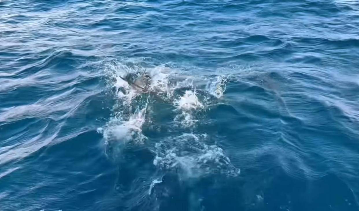 游艇的速度已经够快了,但依旧难以追上海豚游行的速度,它们时而快速向前,时而冲出海面跳跃,这比在水族馆看到的海豚更加真实、自然。