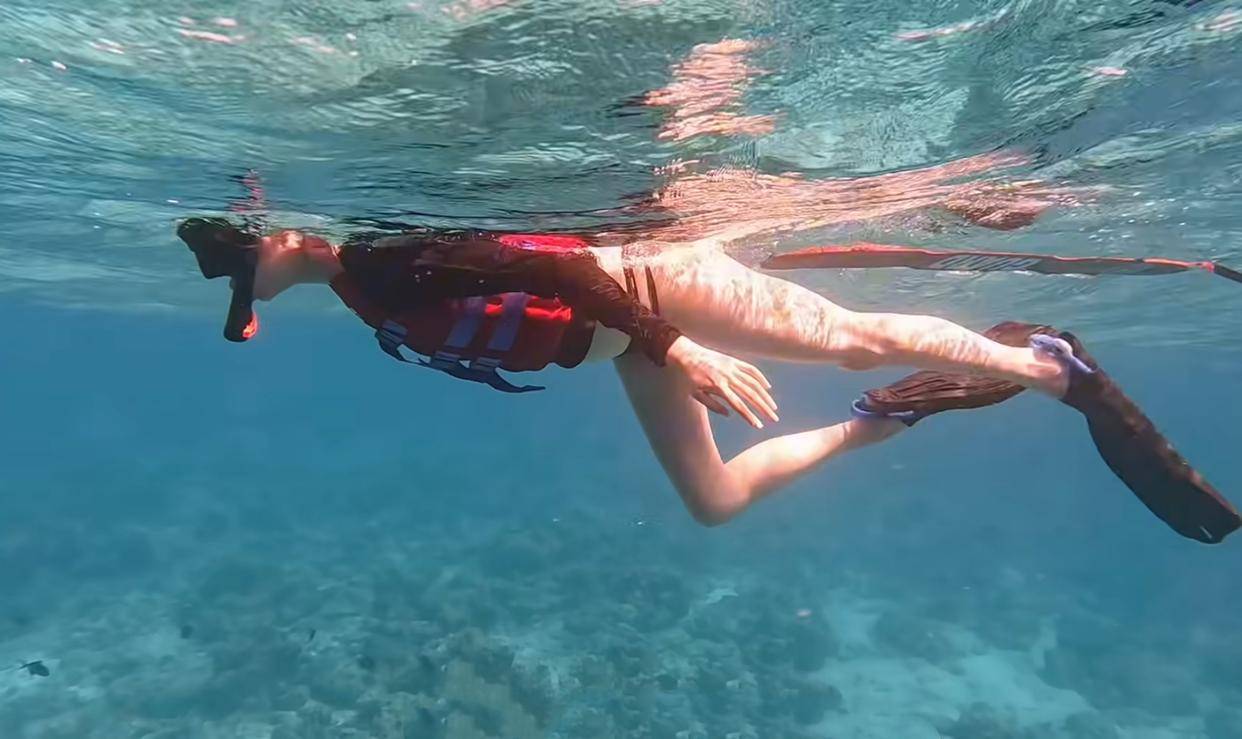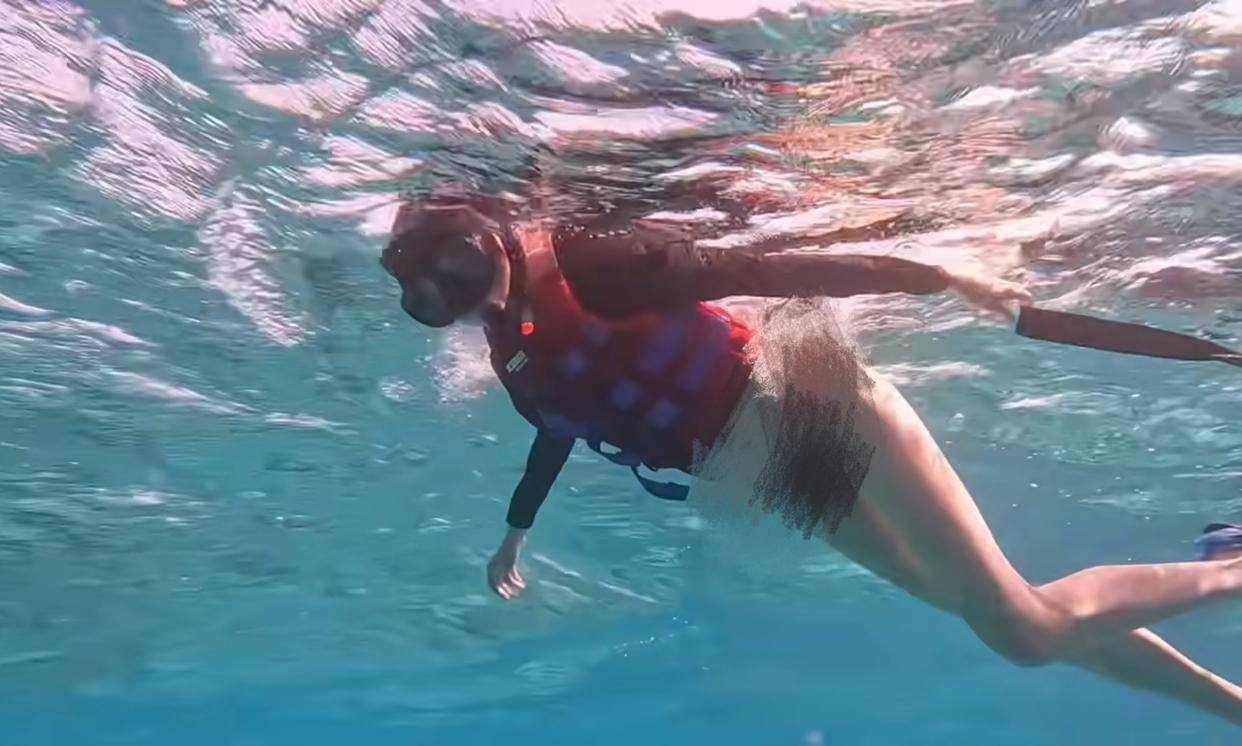 关晓彤在当地工作人员的陪同下体验潜水,她装备齐全安全下潜,在水中畅游很是惬意。