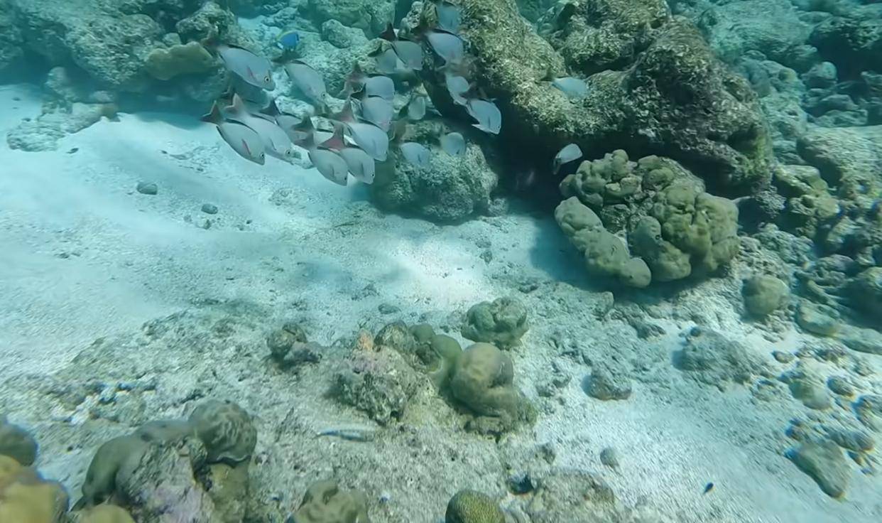 可能是当地游客众多的缘故,这些鱼类早已不惧怕人类,大家和谐相处的画面特别唯美。