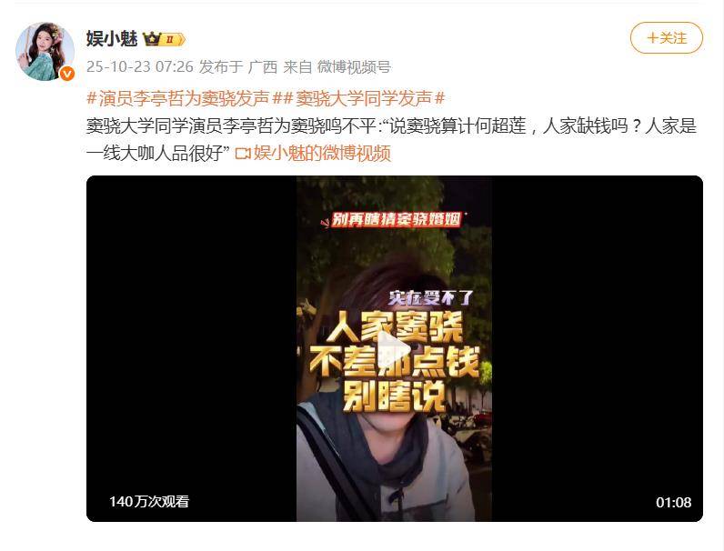大学同学亲自下场辟谣,为窦骁鸣不平——这出“婚变罗生门”又添新番。据网友10月23日爆料,演员李亭哲公开发声,直指近期“窦骁算计何超莲财产&rdquo