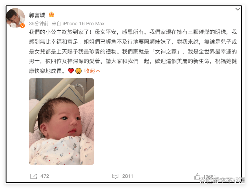 郭富城在文中向大家报平安,称“母女平安,感恩所有”,感慨家中如今有“三颗璀璨的明珠”。字里行间流露出的不是一丝失落,反而满是欣喜与激动。但细心的网友似乎嗅出些许隐含的复杂情绪,觉得他或许是在强颜欢笑。