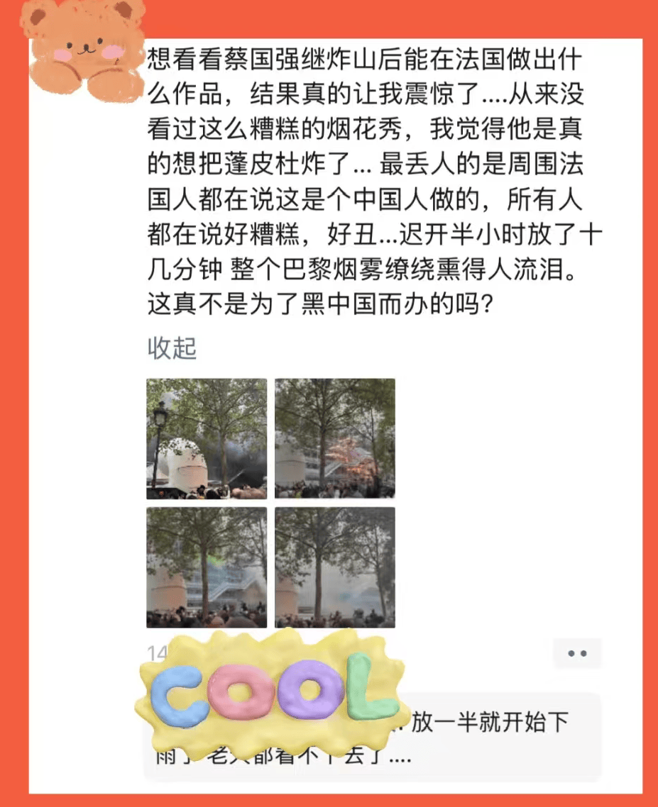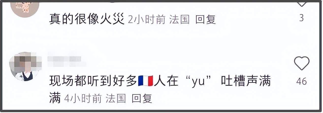 还有大量在现场的中国网友反映了当时的情景,称现场不仅烟雾大,味也大,很像“火灾”,有很多法国人“嘘”声吐槽,还强调是中国人做的,妥妥的抹黑中国形象。而且,这个表演不仅推迟半小时开,还因为中途下雨仓促结束。