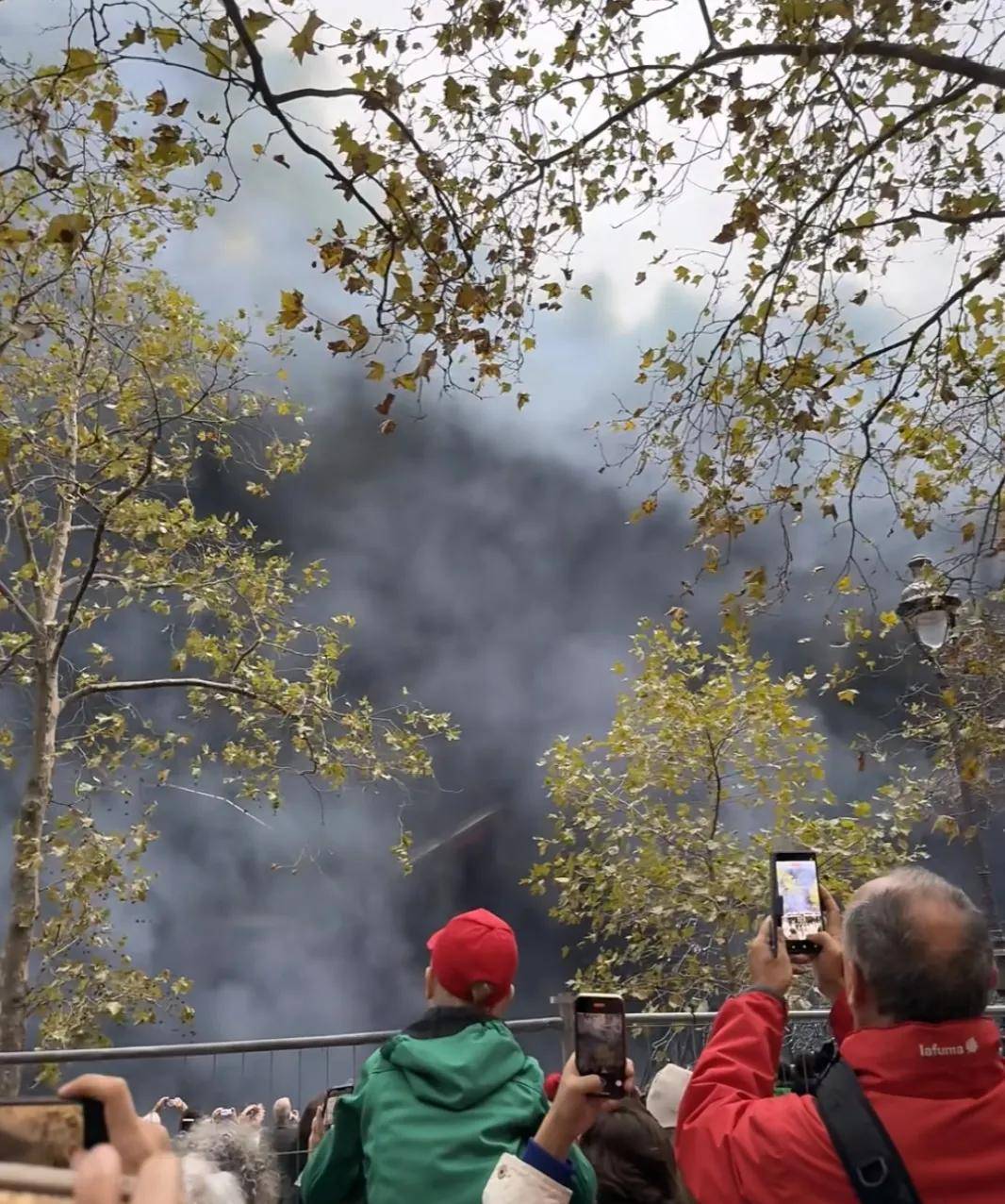 先来看现场画面,所有的烟花装置在外墙,该建筑外墙还都有电灯装置,危险性很高。在烟花炸开的那一刻,围观的市民都把手机高高举起拍摄,炸完以后现场大量的烟雾弥漫开,透过市民的手机可以看到大家拍摄的画面都是一团黑漆漆的浓烟。