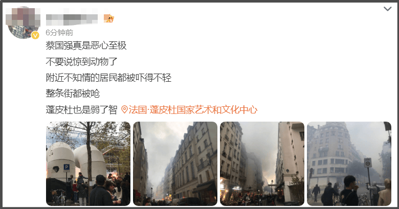 还有在现场的中国网友晒出多张图吐槽,称蔡国强不止惊到现场动物,连不知情的居民都被吓得不轻,整条街都被烟雾呛到,认为蓬皮杜邀请蔡国强的表演完全是失智行为。从现场图能看出来,浓烟散得非常慢,且扩散面很广,影响到了很多人,也因此更让人察觉蔡国强团队辩解在高原炸烟花驱散小动物的说法有多离谱。