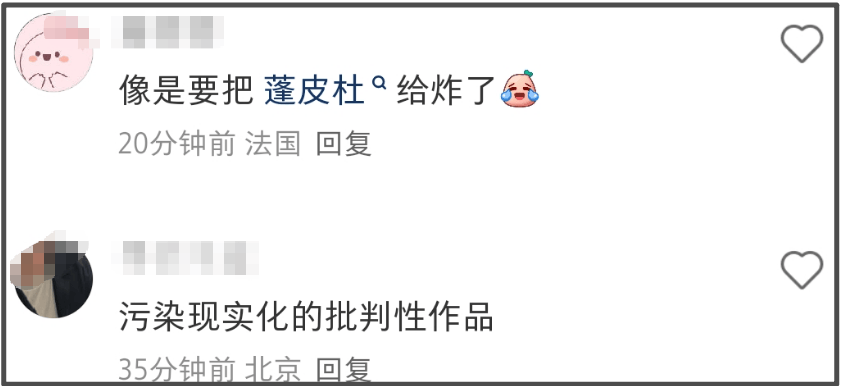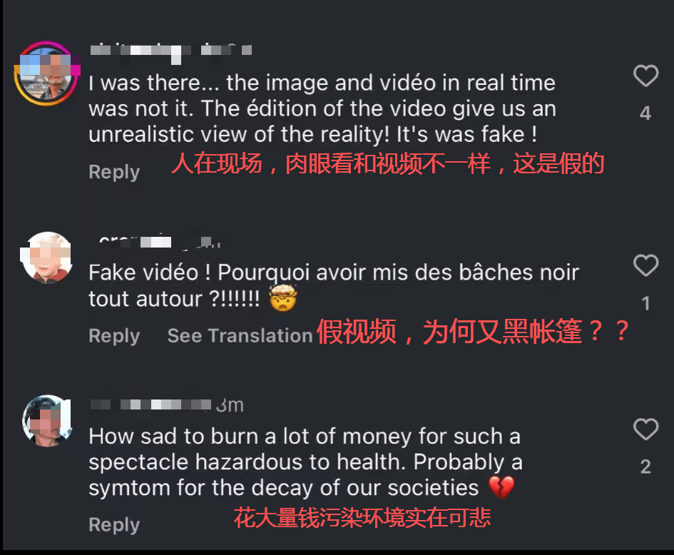 表演结束后,蓬皮杜艺术中心官方在多平台发布了现场画面,烟花绚丽多彩。但是网友并不买账,纷纷在评论区吐槽,有外网网友表示人在现场,肉眼看到的和官方发布的画面不一样,吐槽官方发布虚假事实,质问为何在现场放了“黑色帐篷”。还有外网网友直接怒骂花费大量金钱创造这种污染环境的奇观实在太可悲了,是社会衰败的根源之一。