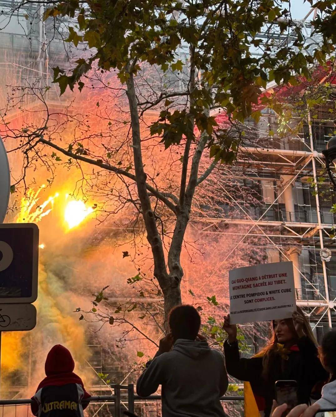 而在现场的观看人群中,还有法国人举牌子的抗议,上面写着蔡国强毁了西藏神山,蓬皮杜和白立方画廊是同谋,在当今的艺术创作中,艺术伦理在哪里?据悉,蔡国强和白立方画廊是合作关系,而蓬皮杜在明知蔡国强“炸山”后还继续合作,也是不知所谓。