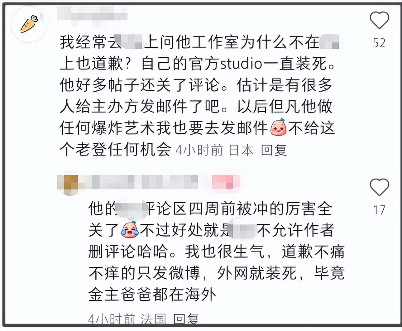蔡国强在“炸山”争议后,工作室并未在外网致歉,还关闭评论屏蔽骂声。因此,也有网友认为外网活动取消可能是官方收到了很多抵制邮件,并且表示会持续在海外抵制蔡国强活动。